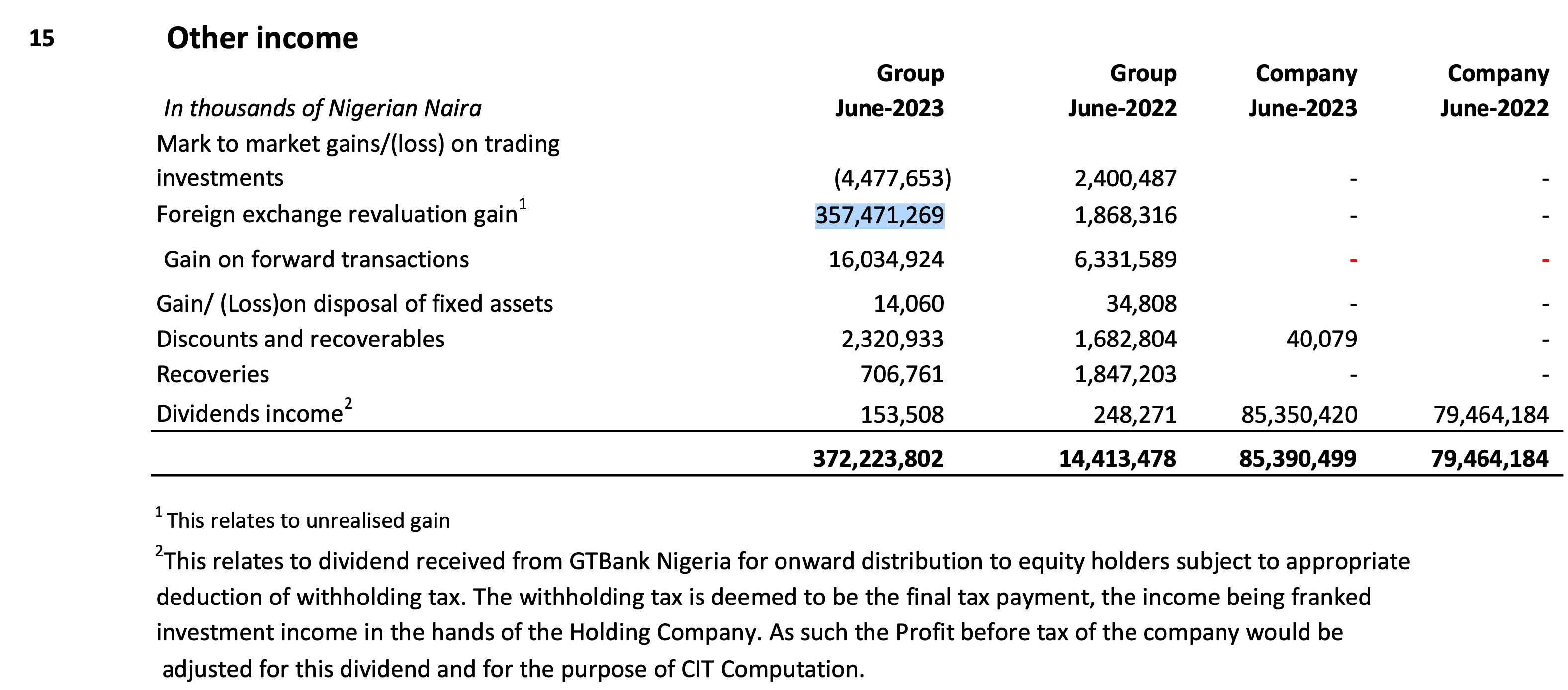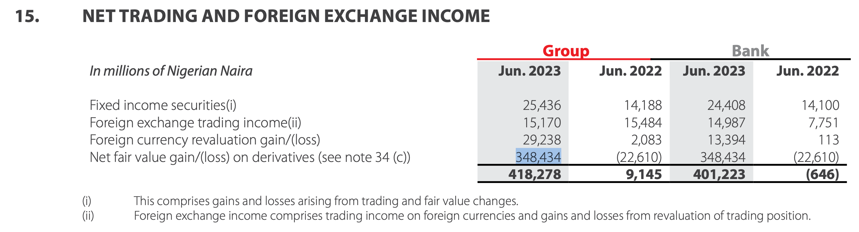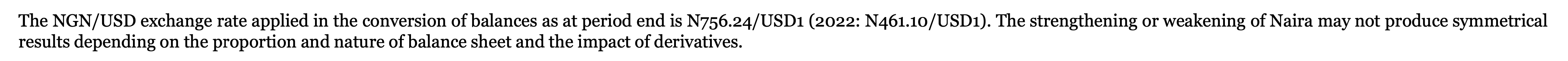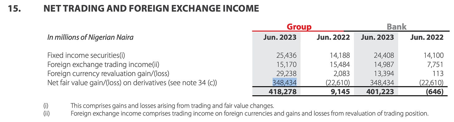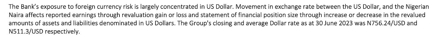 The highlighted line is the bank recording N340 billion in foreign currency gains in the first 6 months of the year. To prepare the accounts up to the end of June 2023, the bank used an exchange rate of N756 to $1. So that N340 billion translates into a nice $450 million gain.
