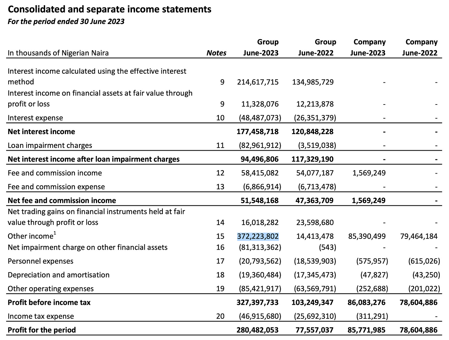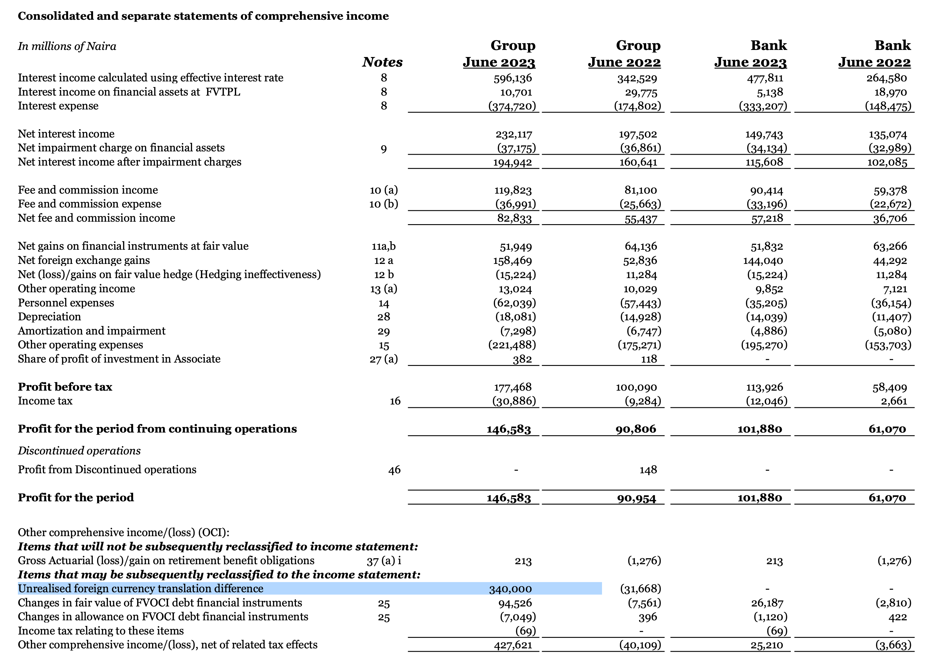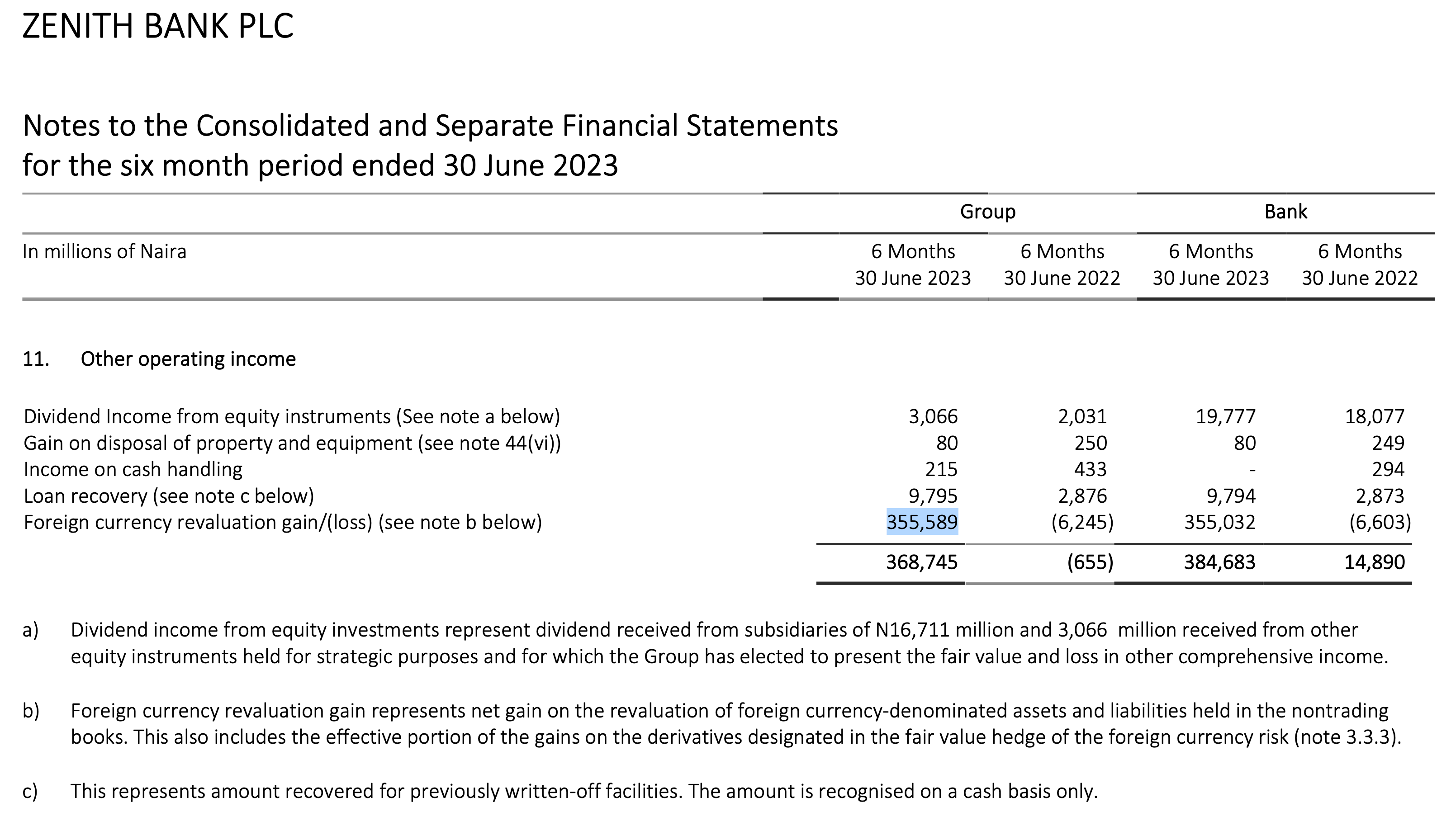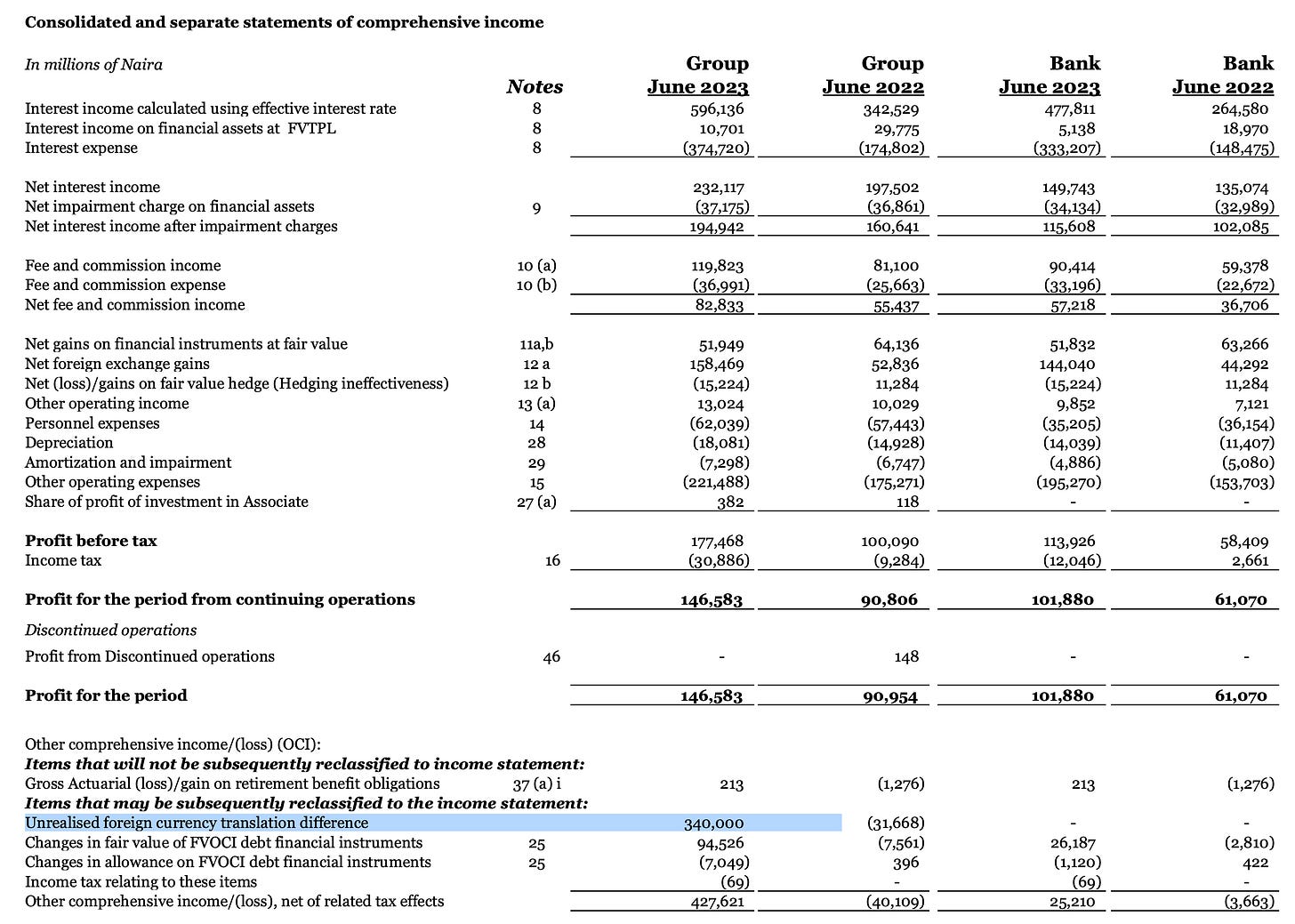 The highlighted line is the bank recording N340 billion in foreign currency gains in the first 6 months of the year. To prepare the accounts up to the end of June 2023, the bank used an exchange rate of N756 to $1. So that N340 billion translates into a nice $450 million gain.