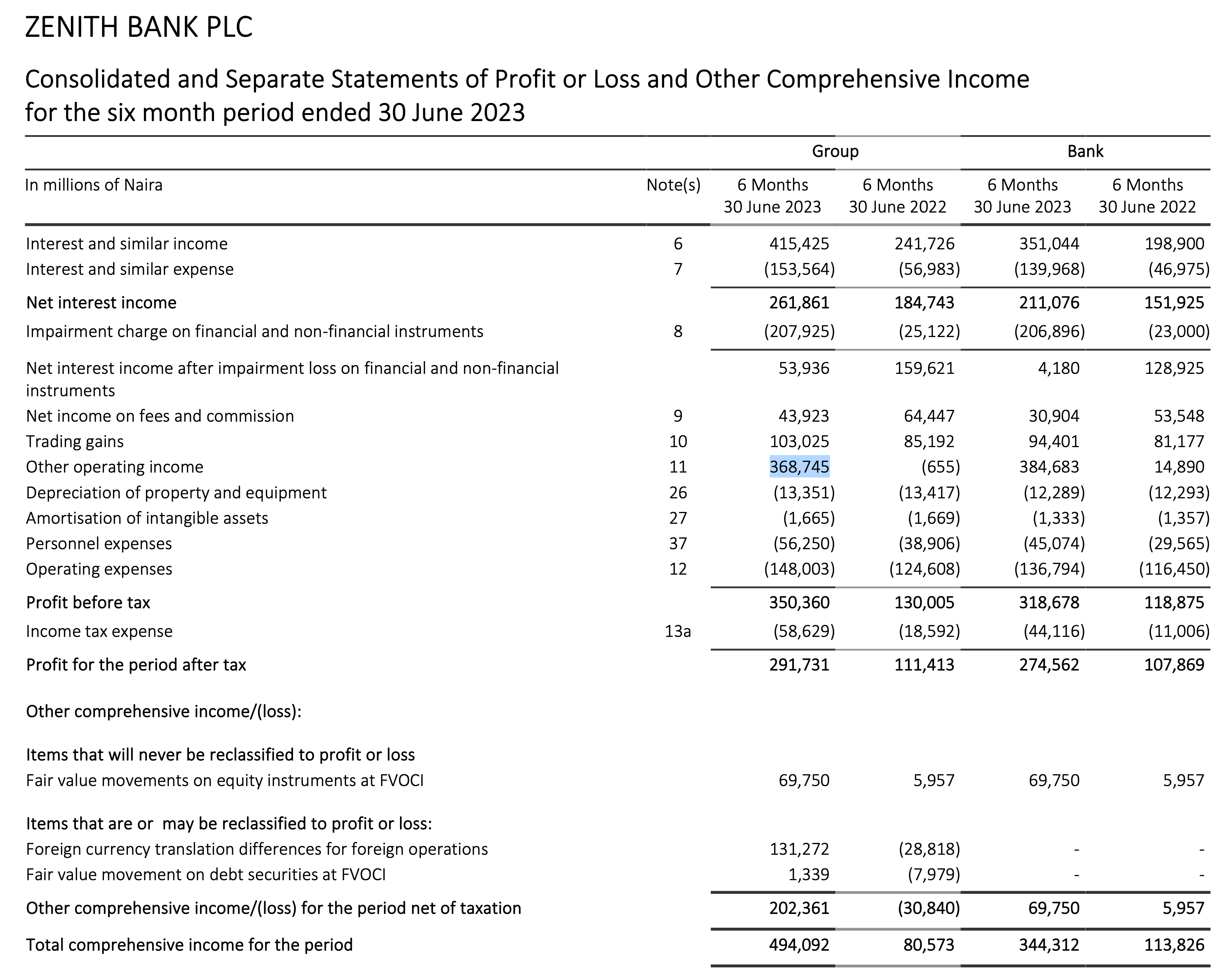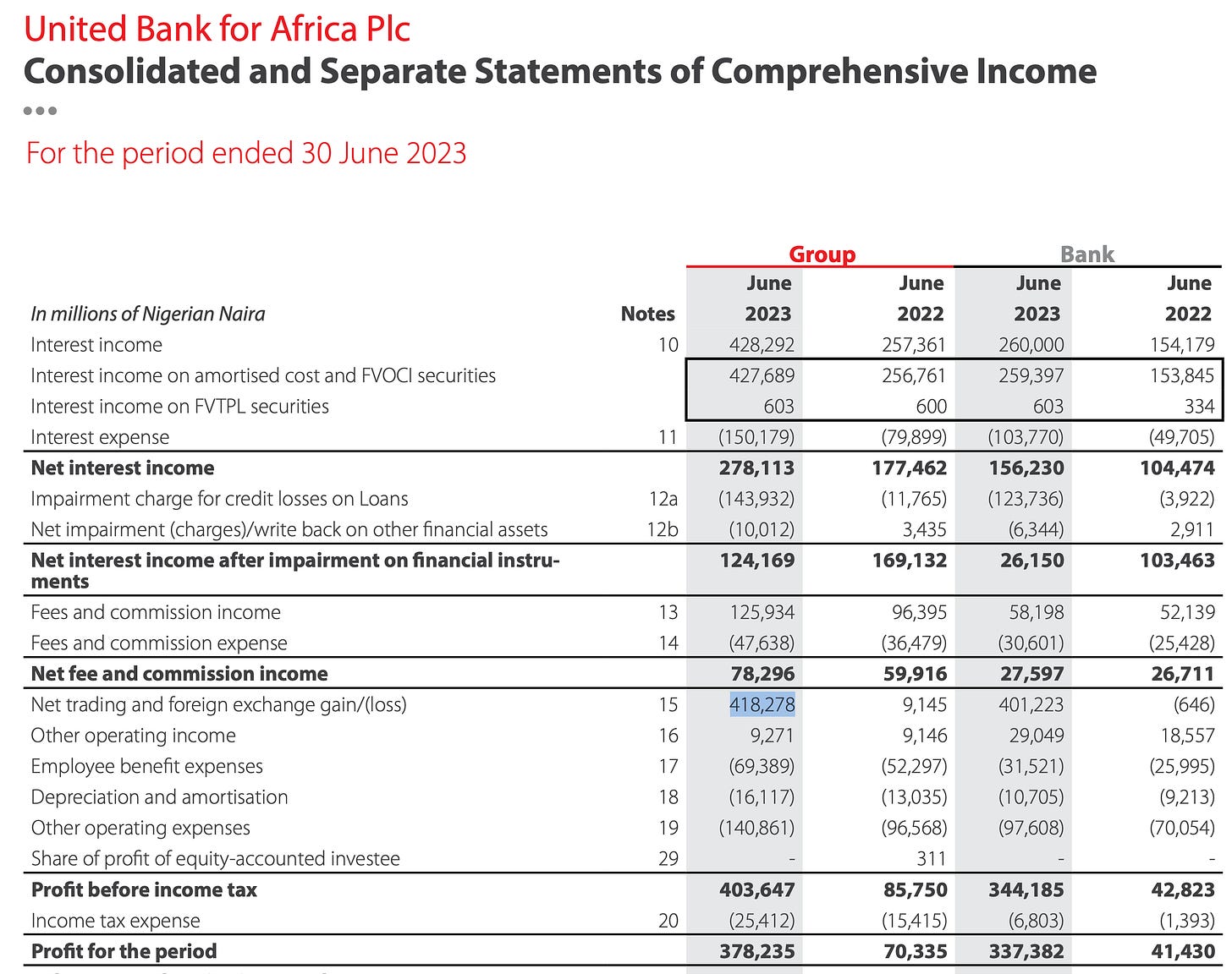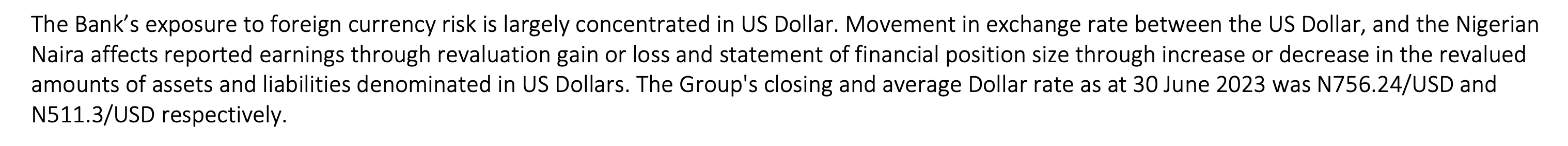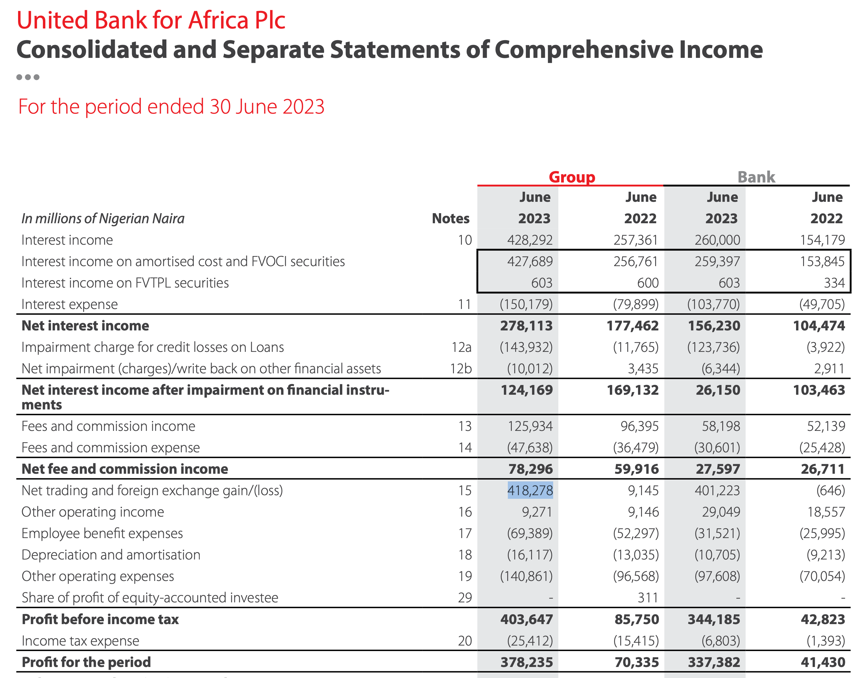 The highlighted line is the bank recording N340 billion in foreign currency gains in the first 6 months of the year. To prepare the accounts up to the end of June 2023, the bank used an exchange rate of N756 to $1. So that N340 billion translates into a nice $450 million gain.
