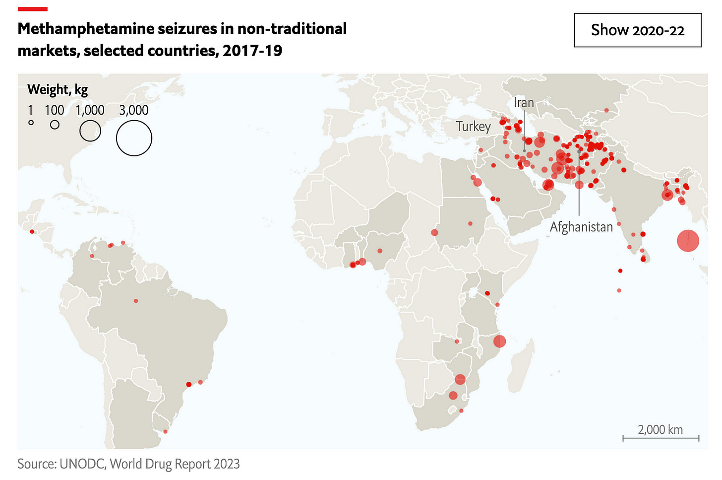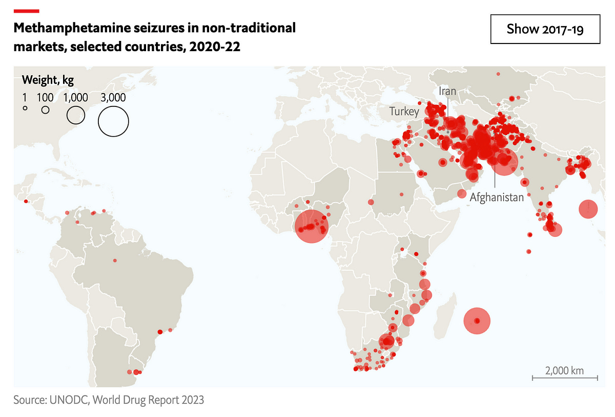 A couple of charts on how methamphetamines are increasingly being seized in unusual places around the world prominently features Nigeria: “A meth lab is much easier to hide than a field of poppies. Unlike cocaine, heroin or cannabis, synthetic drugs do not require land or an army of cheap labourers to produce” — The Economist