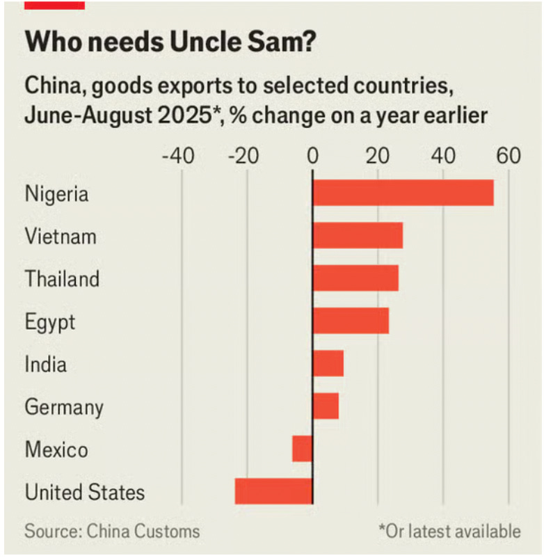 The world beyond America, then, is snapping up more Chinese goods than ever before. This is particularly true of the global south, where China’s Belt and Road Initiative (bri), established in 2013, has laid firm foundations. The bri’s pace has quickened since Mr Trump returned to the White House. In the first half of 2025, bri activity reached a record, with over $120bn in new contracts and investment handed out in the scheme, according to the Griffith Asia Institute, a research outfit. Nearly half of the initiative’s construction contracts, which are awarded to Chinese firms, are for projects in Africa. These amounted to more than $30bn—five times the amount in the same period the year before, and more than for any other region.