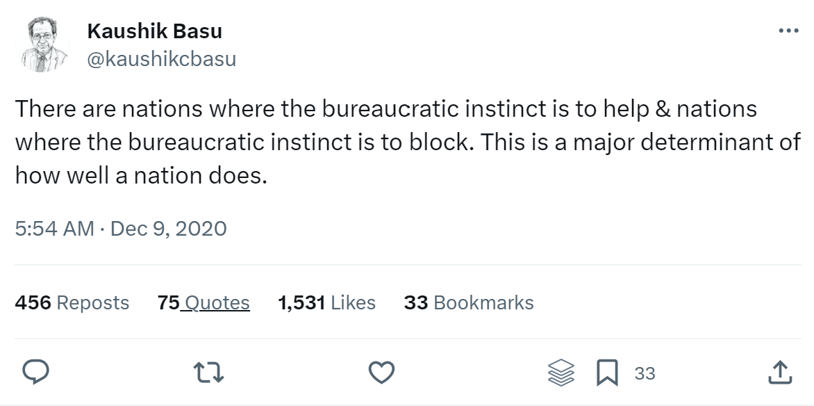 It is important to make a distinction here. The reason for economic regulation through government institutions is because of negative externalities. Someone has to ensure that a chemical plant is not poisoning the water supply, that a digital app is not secretly collecting people’s private information, or that a group of producers is not colluding to fix the price of a commodity. Preventing private economic activity from causing public harm is vital and justifies the need for regulations. But it is different from what Indian economist Kaushik Basu called ‘’a culture of permissionism’’ - where the regulatory philosophy of the government and bureaucracy is motivated by the power and ability to choose who should thrive. The resulting business environment from this philosophy creates strong incentives for extracting rent by the government and state capture by businesses.