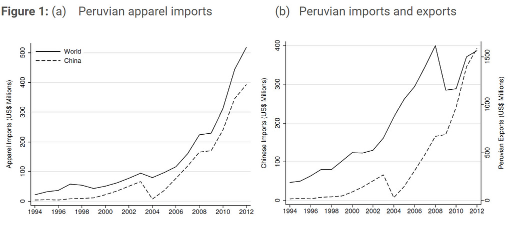 Import competition intensified for the Peruvian apparel industry after China joined the WTO in 2001. Before China entered the WTO, most of the clothes sold in Peru were made by Peruvian firms. As Panel (a) of Figure 1 shows, in just one decade, China inundated the domestic economy with cheaper clothing. As a result, Peruvian firms lost substantial domestic market share, and by 2011, half of the clothes sold in the country were of Chinese origin. The situation was no different in Peru’s most prominent export destinations: Chinese import competition also increased in the United States and other developed countries. This represented a massive negative shock for Peruvian producers.