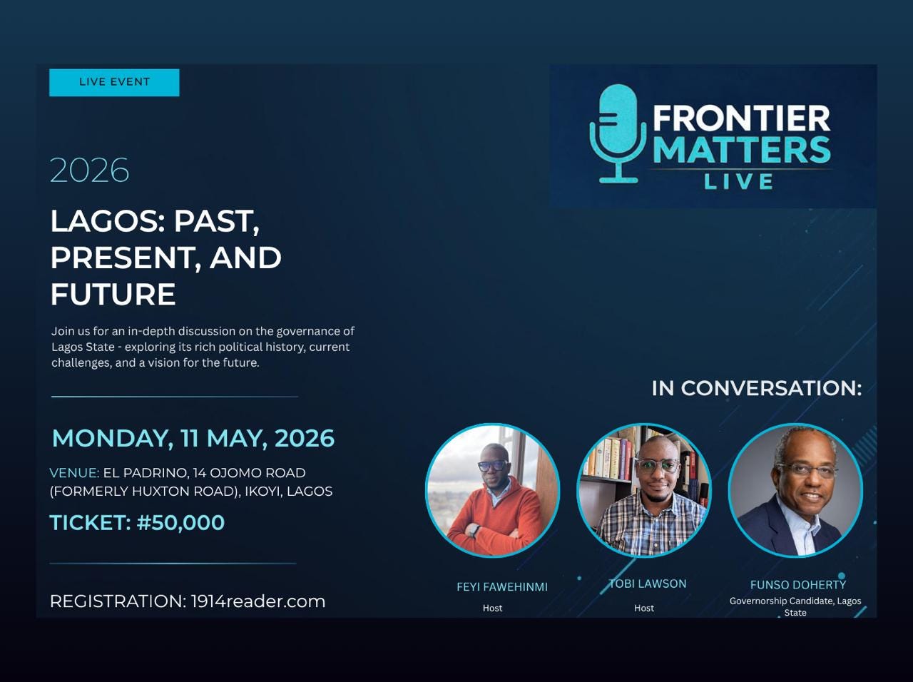 Our guest will be Funsho Doherty, who has just declared his intention to run for Lagos governor in 2027. The recording will be released afterwards on YouTube and Spotify as a full Frontier Matters episode.