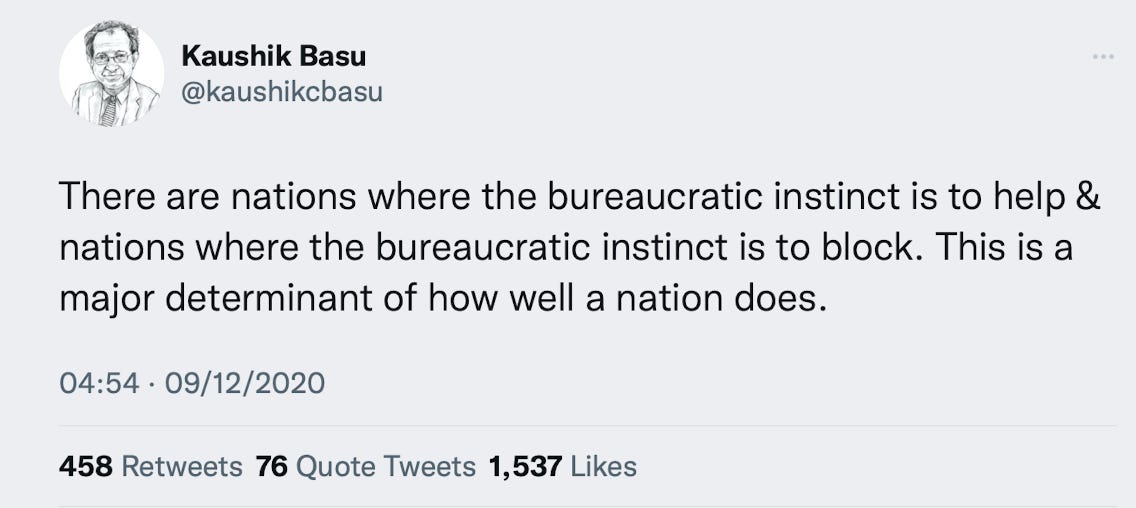 Trying to understand institutions beyond these popular platitudes is where the clarity ends. But some of the things often attributed to good institutions are a bureaucracy that delivers on its functions, transparency, and accountability in public spending, adherence to rules rather than personal discretion, and a general orientation towards the interest of the citizens rather than just the few who are connected to politicians and public officials. In short, most of us conceive of good institutions in the mode of the governments and bureaucracies of high-income democratic countries like the U.S., U.K., Western Europe, etc.