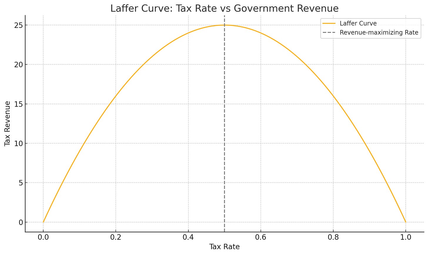 The Laffer Curve is empirically complicated. The shape and peak of the curve (see diagram) vary depending on the economy, the tax base, the kind of tax (income, capital, corporate), and time. For most developed countries, empirical studies tend to show that current tax rates are well below the revenue-maximising point. That means cutting taxes is unlikely to increase revenue in these contexts. In some developing economies, where tax compliance is low and avoidance is rampant, the Laffer effect might be more relevant. In economies with high informality, raising rates often pushes activity underground; hence, cutting taxes on the formal sector might broaden the base instead, but overall, the evidence on the effects of tax cuts on revenues in developing economies is not robust.