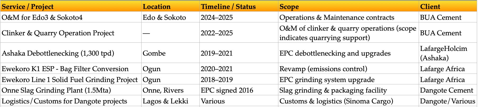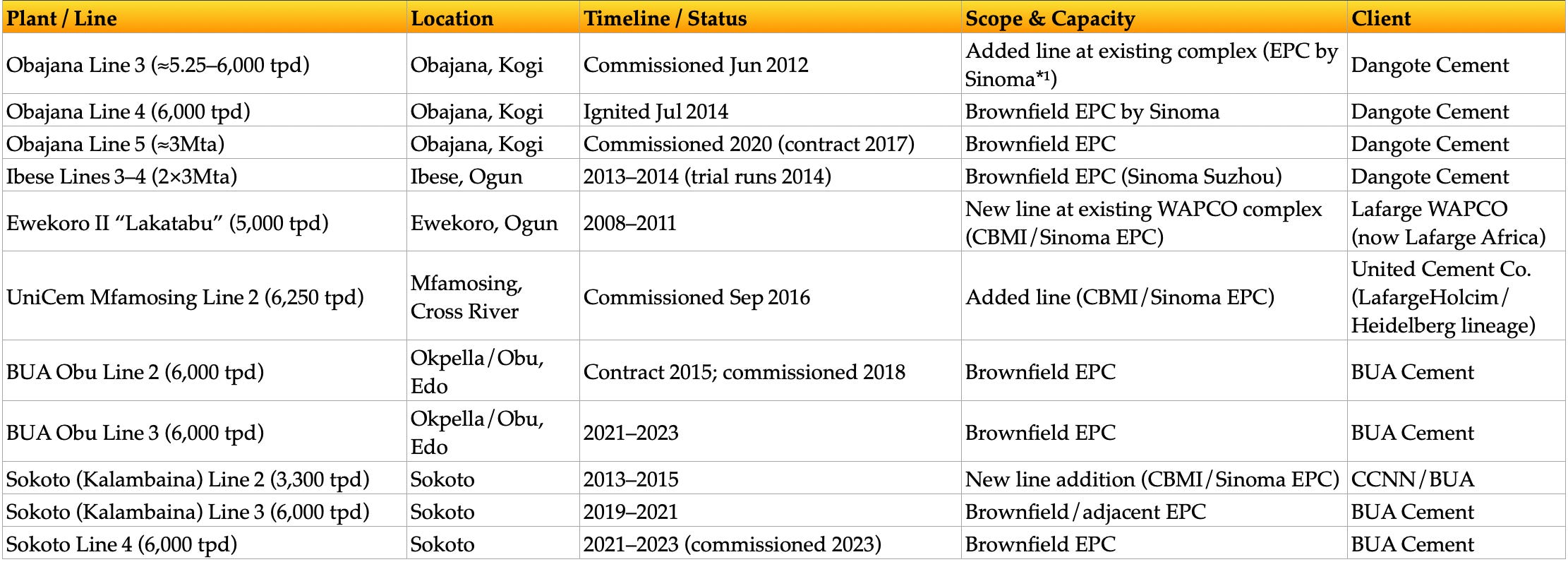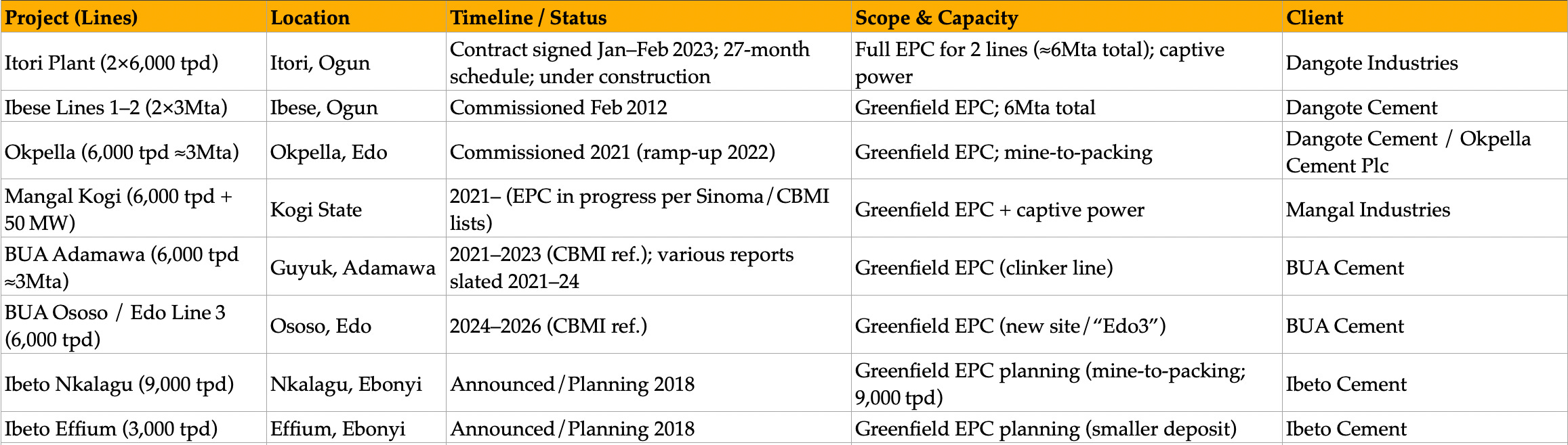 The following table chronicles Sinoma's near-total dominance in constructing Nigeria's new generation of greenfield integrated cement plants: