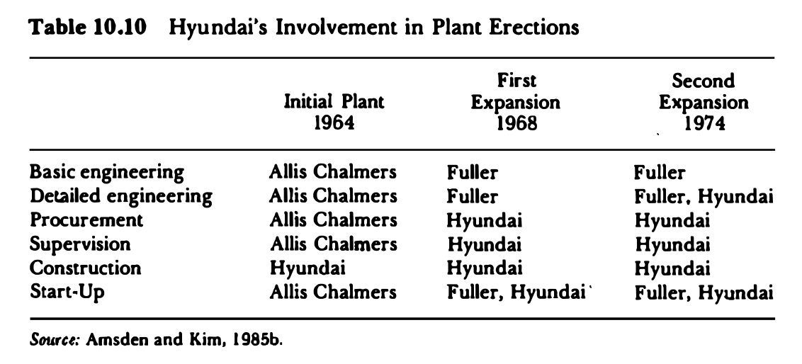 The Hyundai group, though its cement venture was not its largest, treated the project as a critical laboratory for technological learning. As Amsden details, for its first plant in 1964, Hyundai relied entirely on the American firm Allis Chalmers for basic engineering, detailed engineering, procurement, and supervision, undertaking only the construction itself. Crucially, however, the company consciously “unpackaged” the technology transfer. Within a decade, as illustrated in the table below, Hyundai had taken over every aspect of project execution except for basic engineering - the domain of specialised process experts. It was this cultivated mastery, not merely the capacity to produce cement, that provided the foundation for Hyundai’s future. The cement plant became a training ground for managers who later applied their skills in quality control, process engineering, and inventory management to launch Hyundai Motors, which would two decades later become a global automotive exporter.